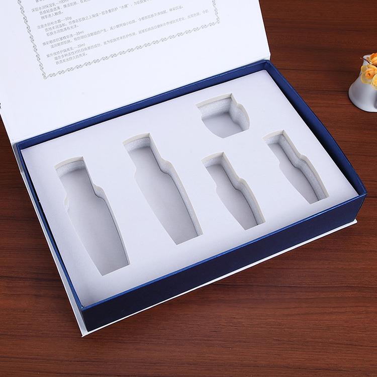 而且盒子的设计非常漂亮,白色,天蓝色。插入选项是白色的PE泡沫,上面安装了白色eva。托盘上切下来,以精确地固定产品并保护它们。