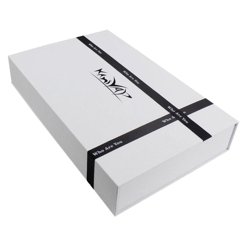 盒子精加工:自定义的特定徽标黑色箔纸在外部盖子上,在内盖上白色箔,徽标印刷的黑色丝带交叉在顶盖上。